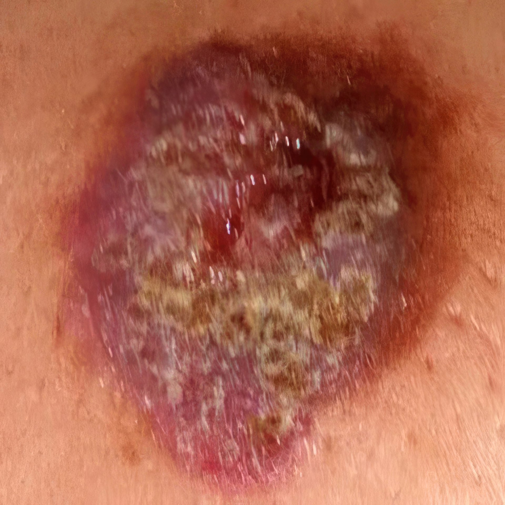 Ulzerierte nasale Hautveränderung seit 8 Monaten, 3 x 2 cm im