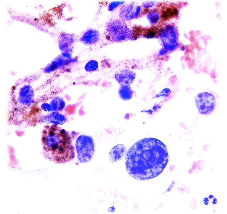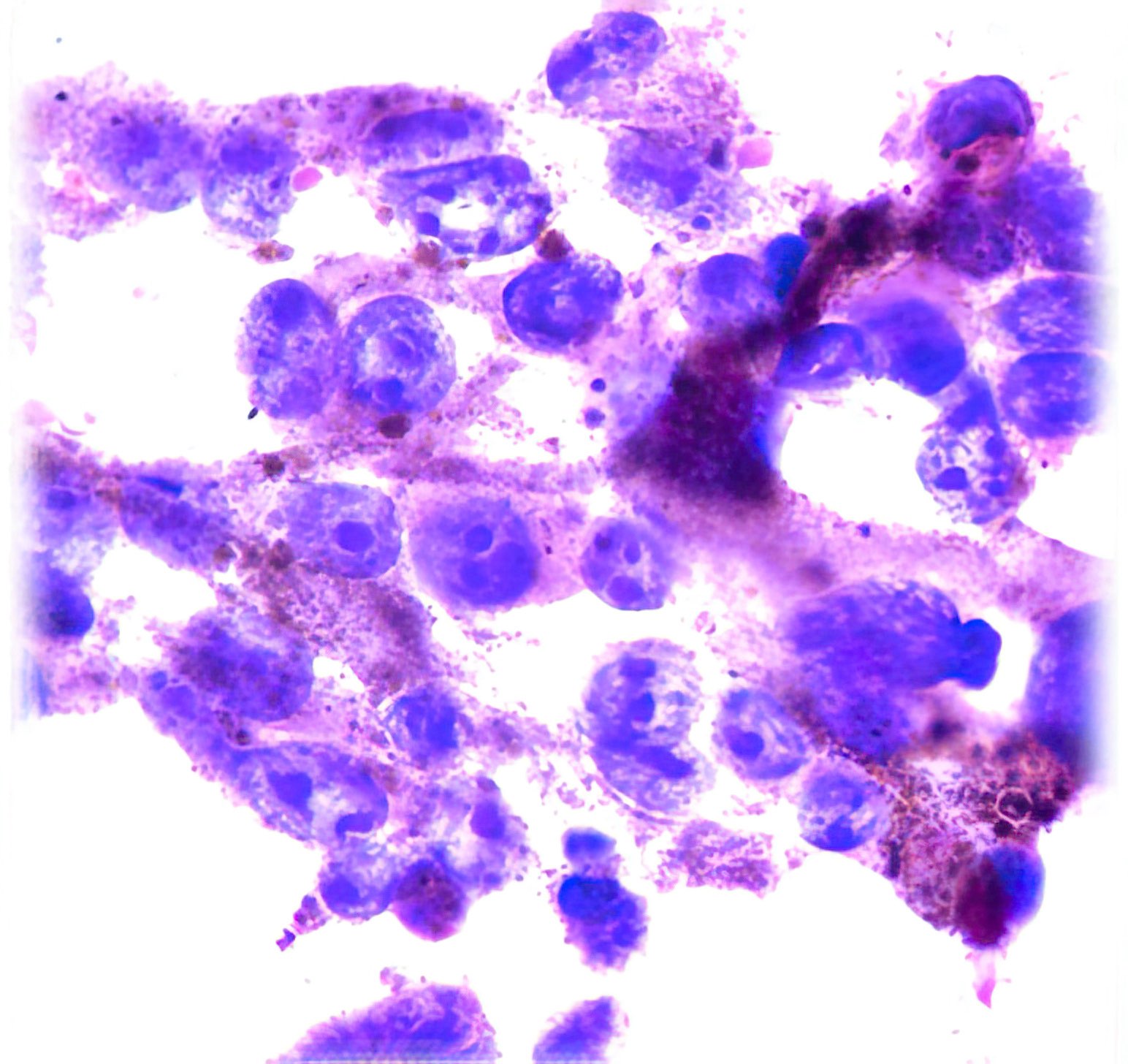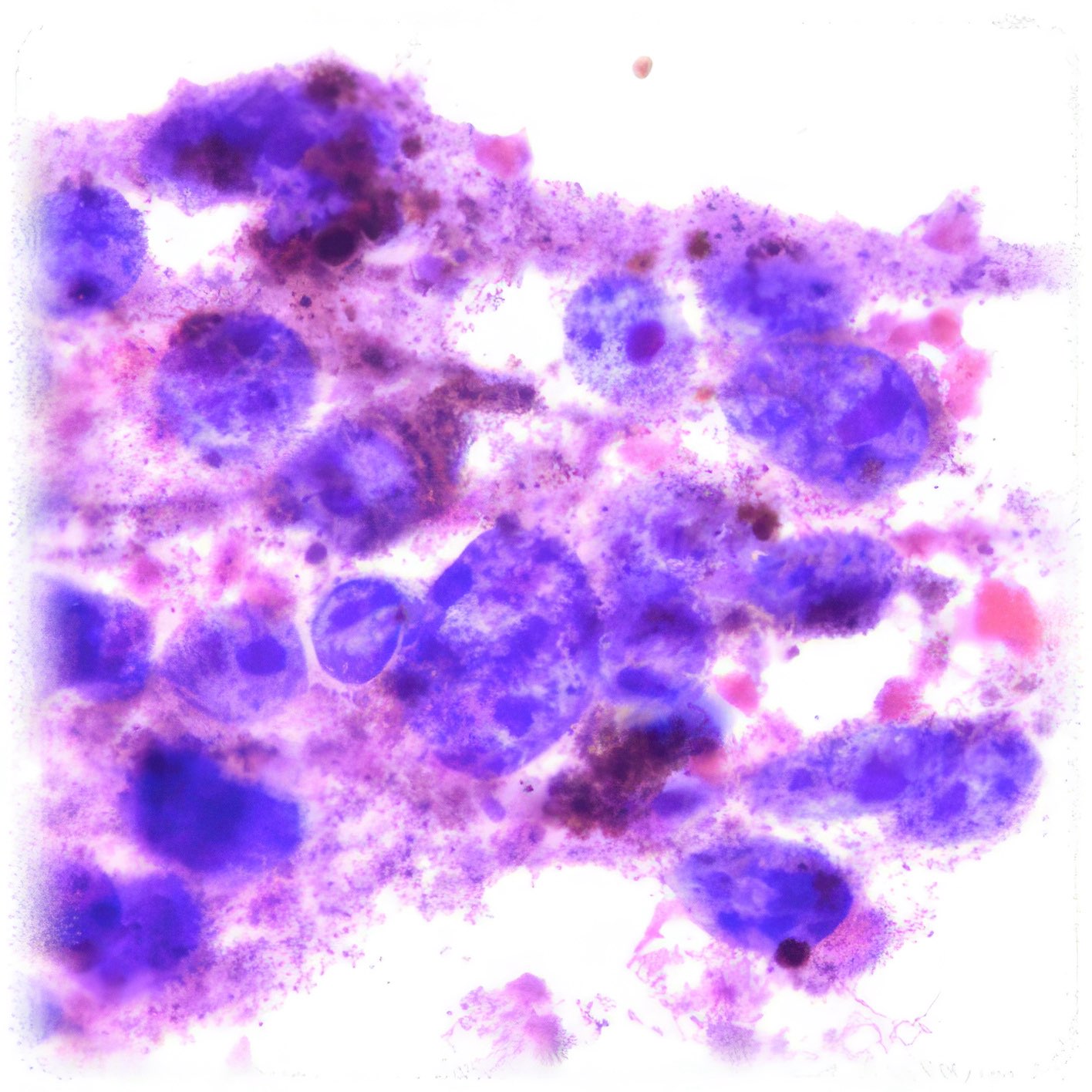 Einige lose Ansammlungen großer atypischer Zellen. Die Zellkerne variieren in der Größe, sind deutlich grob strukturiert und enthalten gelegentlich einen Nukleolus. Das Zytoplasma variiert in der Breite und ist manchmal geschwänzt. Der Hintergrund besteht aus Blut, einigen Entzündungszellen und Zelltrümmern.