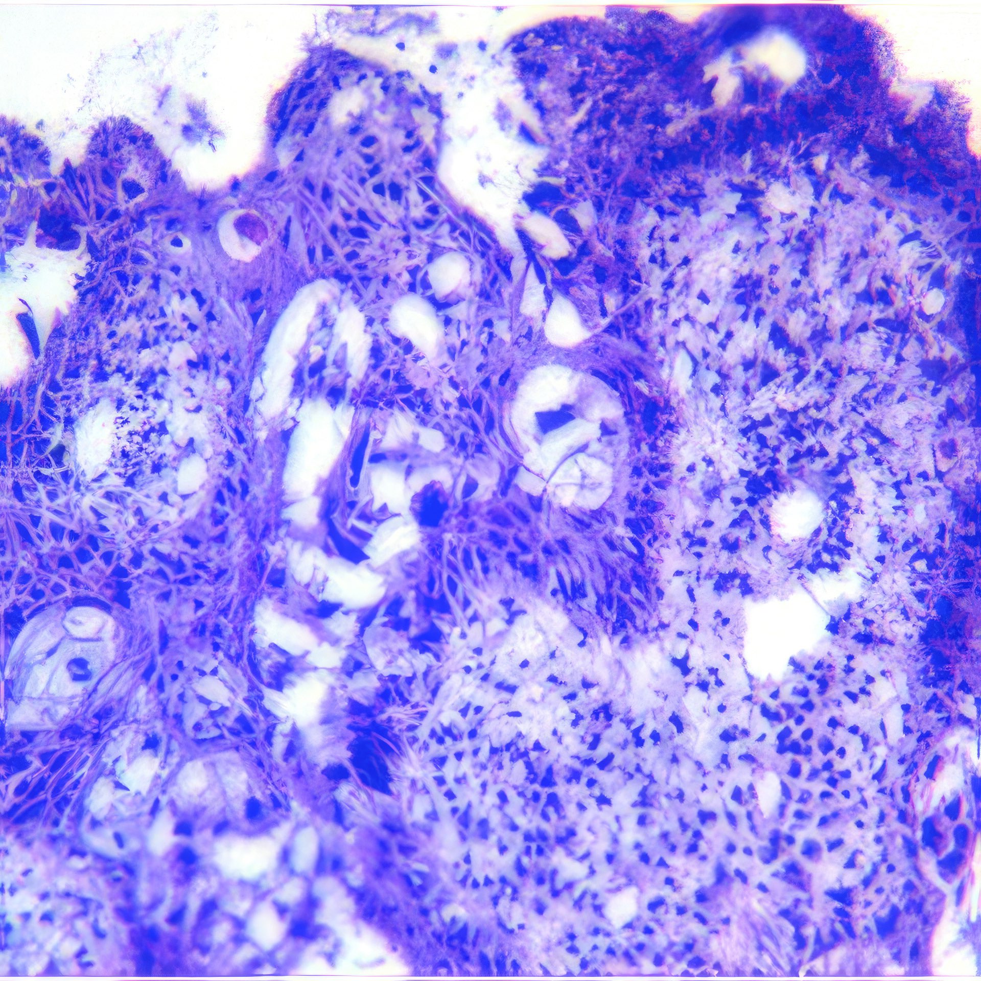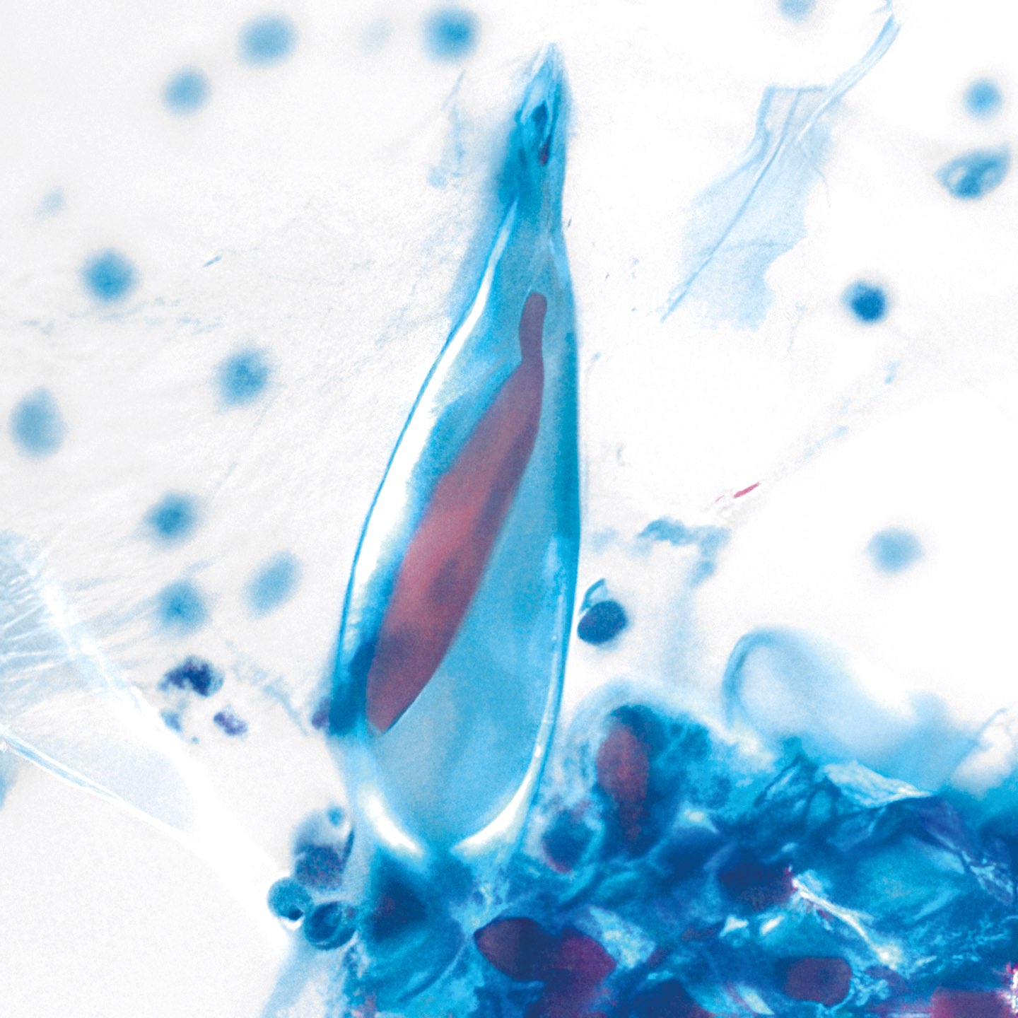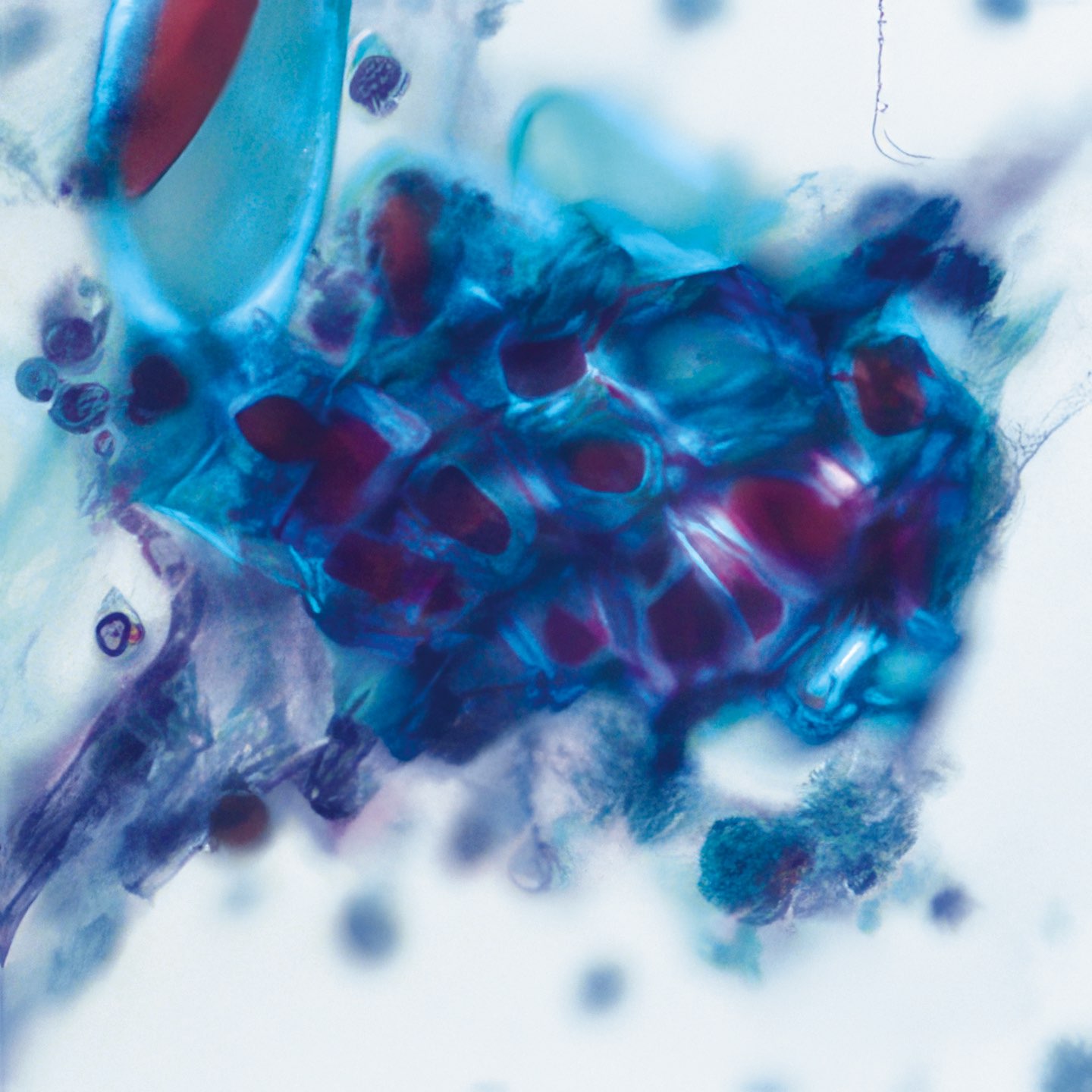 Einige lose Ansammlungen großer atypischer Zellen. Die Zellkerne variieren in der Größe, sind deutlich grob strukturiert und enthalten gelegentlich einen Nukleolus. Das Zytoplasma variiert in der Breite und ist manchmal geschwänzt. Der Hintergrund besteht aus Blut, einigen Entzündungszellen und Zelltrümmern.