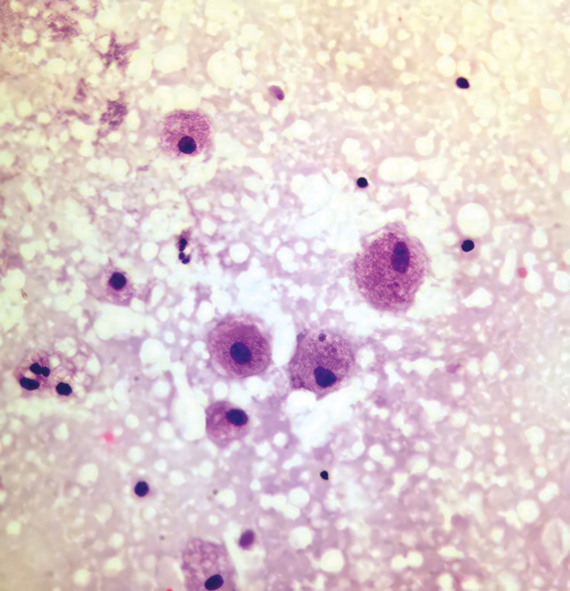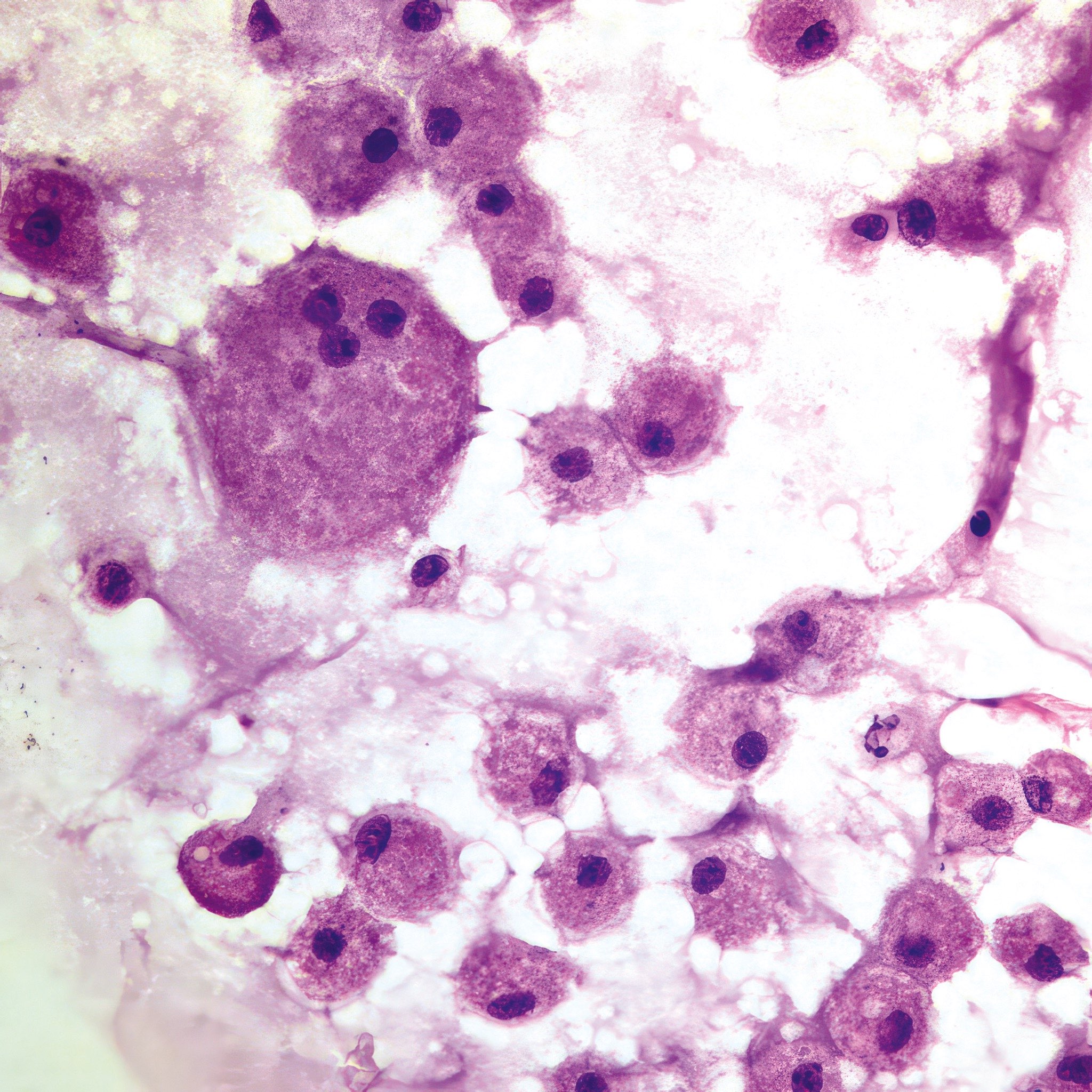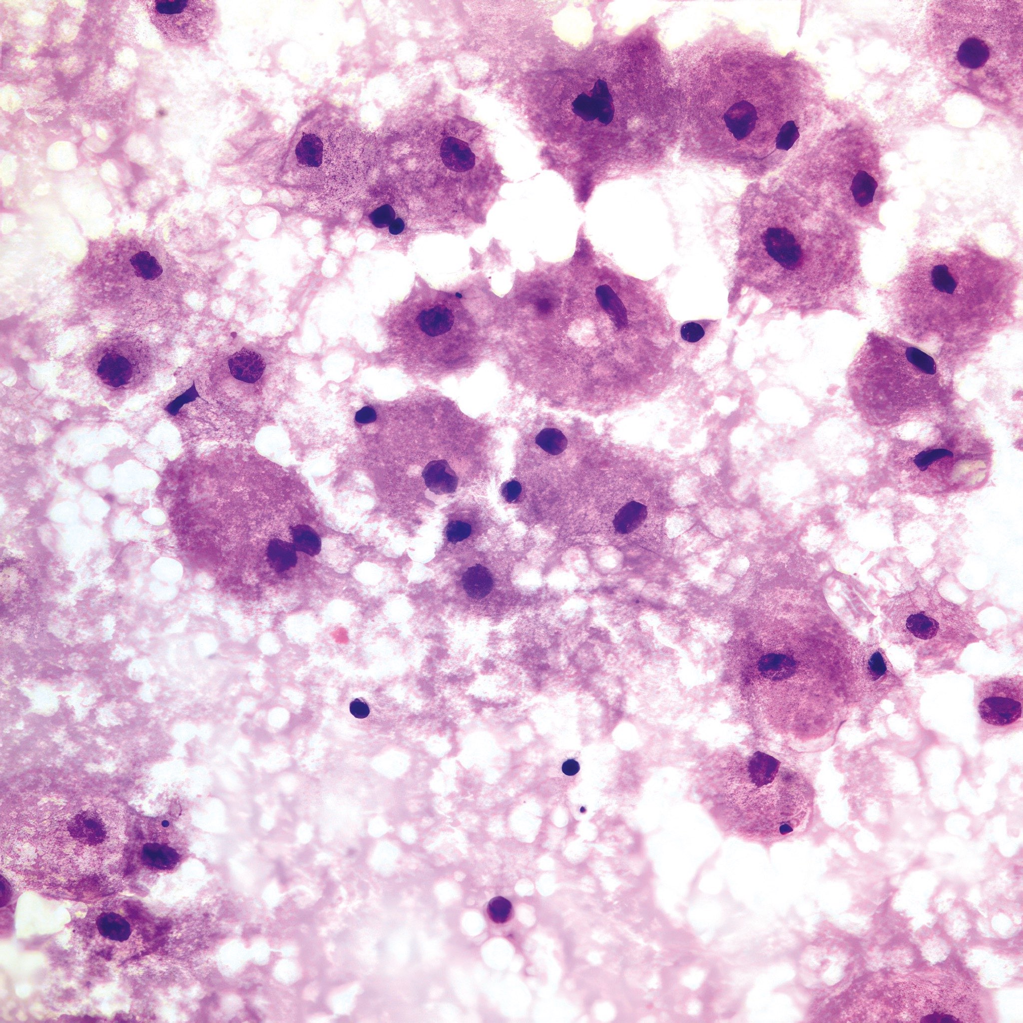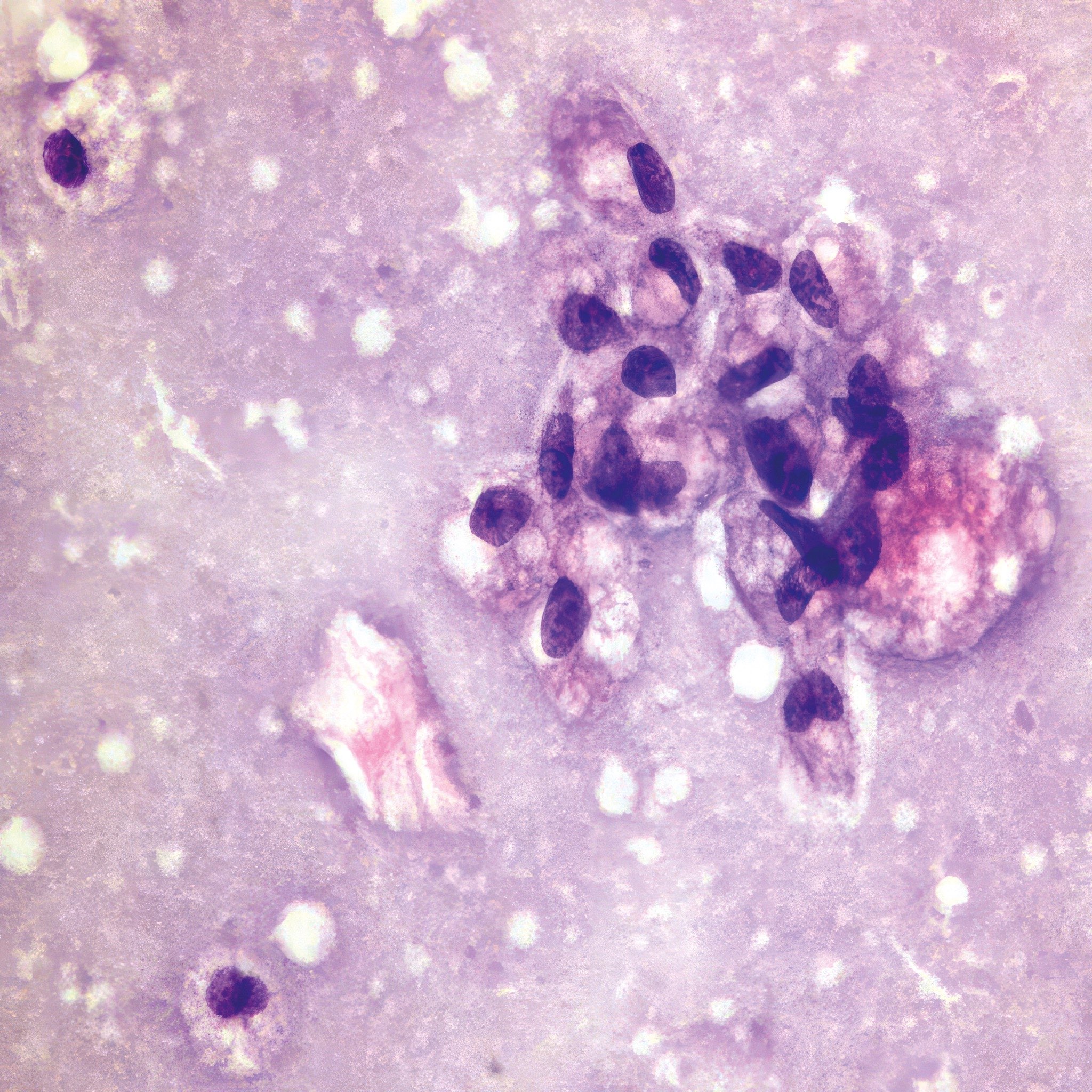 Einige lose Ansammlungen großer atypischer Zellen. Die Zellkerne variieren in der Größe, sind deutlich grob strukturiert und enthalten gelegentlich einen Nukleolus. Das Zytoplasma variiert in der Breite und ist manchmal geschwänzt. Der Hintergrund besteht aus Blut, einigen Entzündungszellen und Zelltrümmern.
