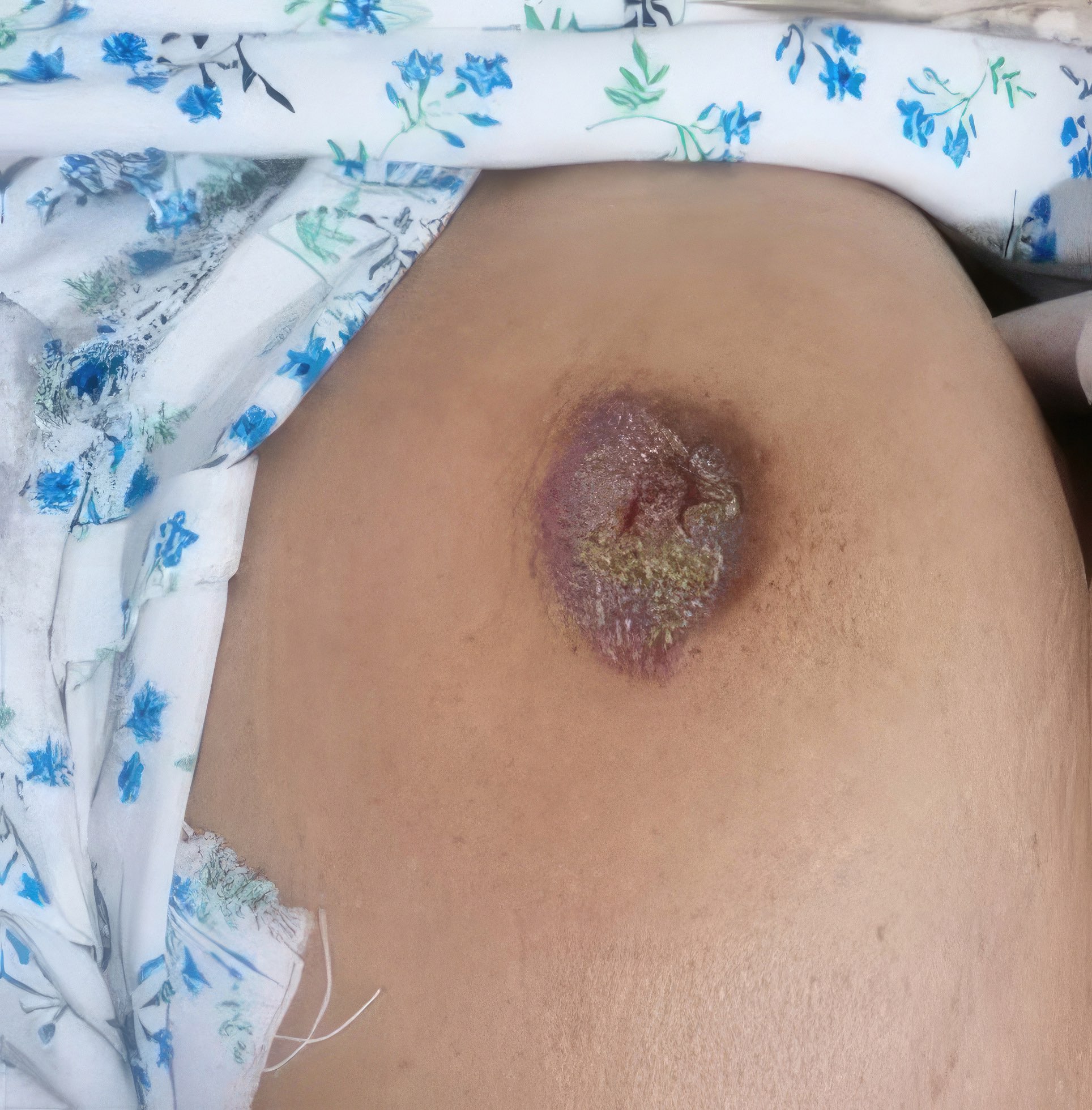 Die zytologischen und histologischen Befunde sind charakteristisch für das Paget-Syndrom. Histologisch würden die Zellen PAS-positiv sein. Das Brustödem, die nicht eingezogene Brustwarze und die axilläre Schwellung weisen auf ein tiefsitzendes Karzinom hin, das bereits in die axillären Lymphknoten metastasiert hat. Die Kombination von Karzinom und Morbus Paget ist nicht ungewöhnlich 1. - Die extrem atypischen Zellen können zu einer Verwechslung mit einem Plattenepithelkarzinom führen 2. Andererseits unterscheidet dies die Zellen des Morbus Paget von denen des Adenoms, das ebenfalls in der areolären Region auftritt 3, 4. Schließlich können die makroskopisch erscheinenden vesikulären Strukturen einen Pemphigus vulgaris, eine Autoimmunerkrankung der Haut, simulieren 5.