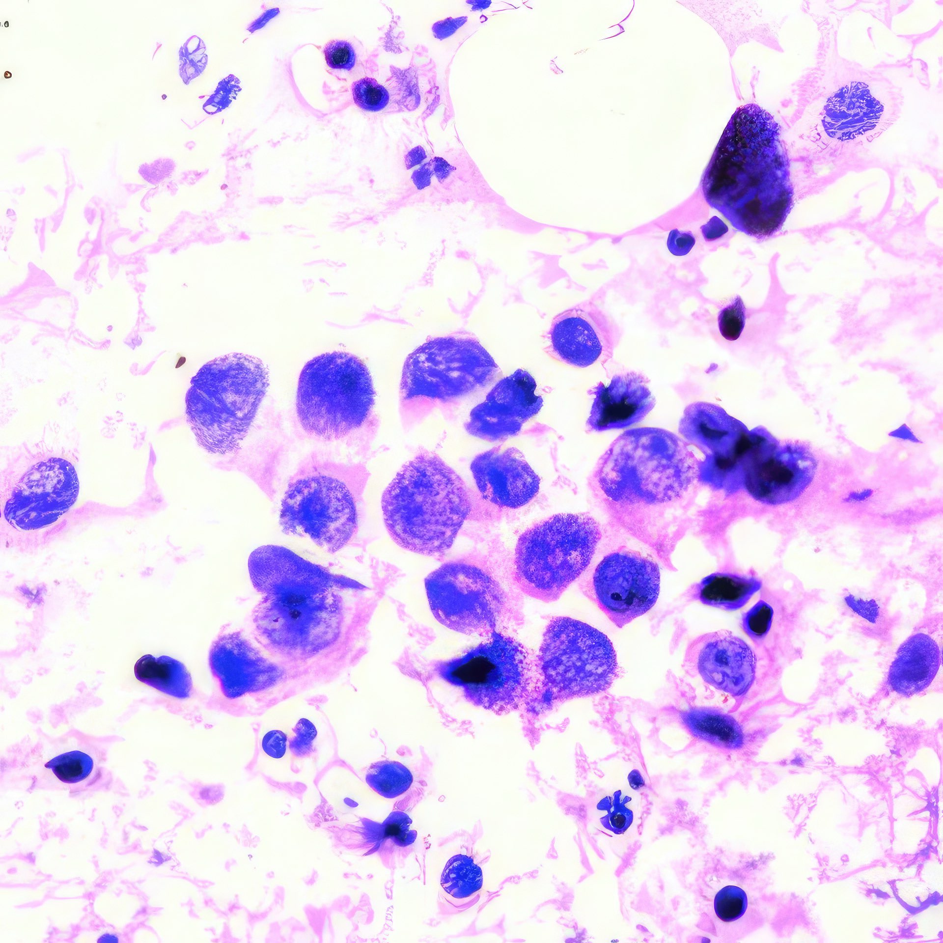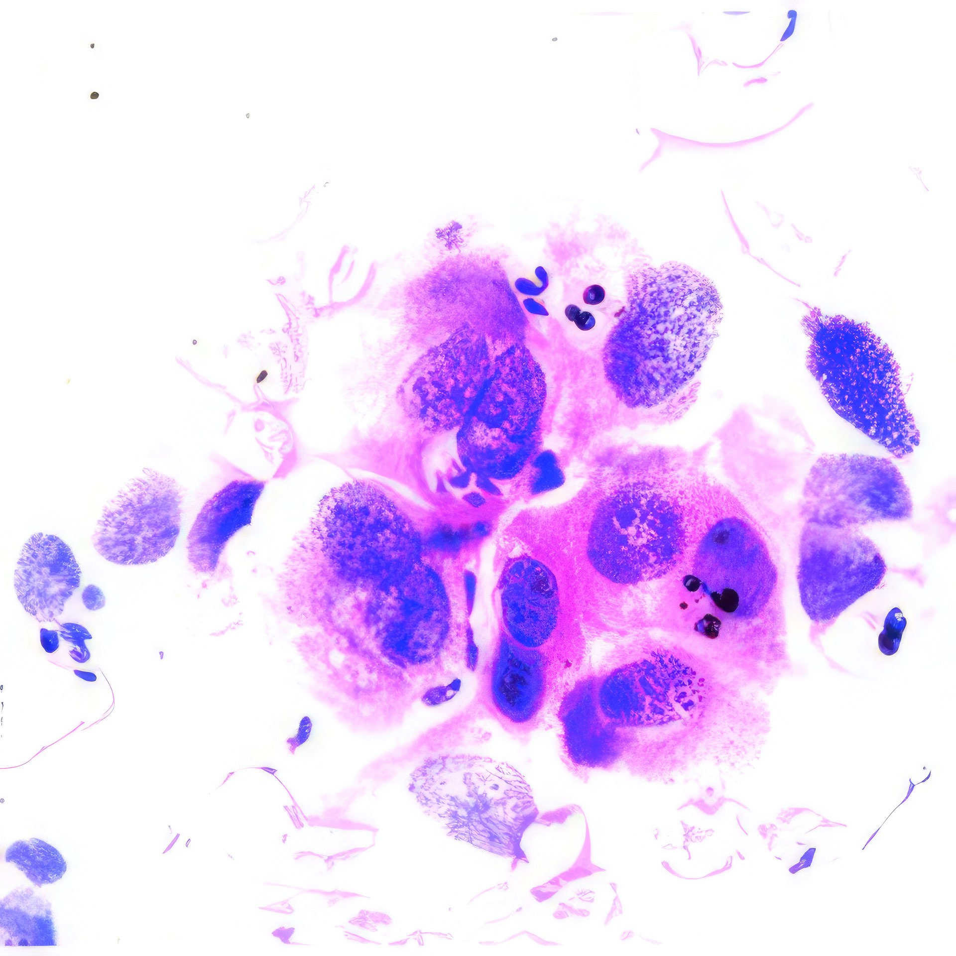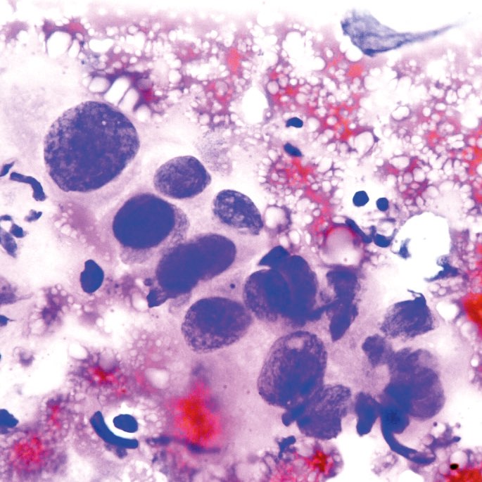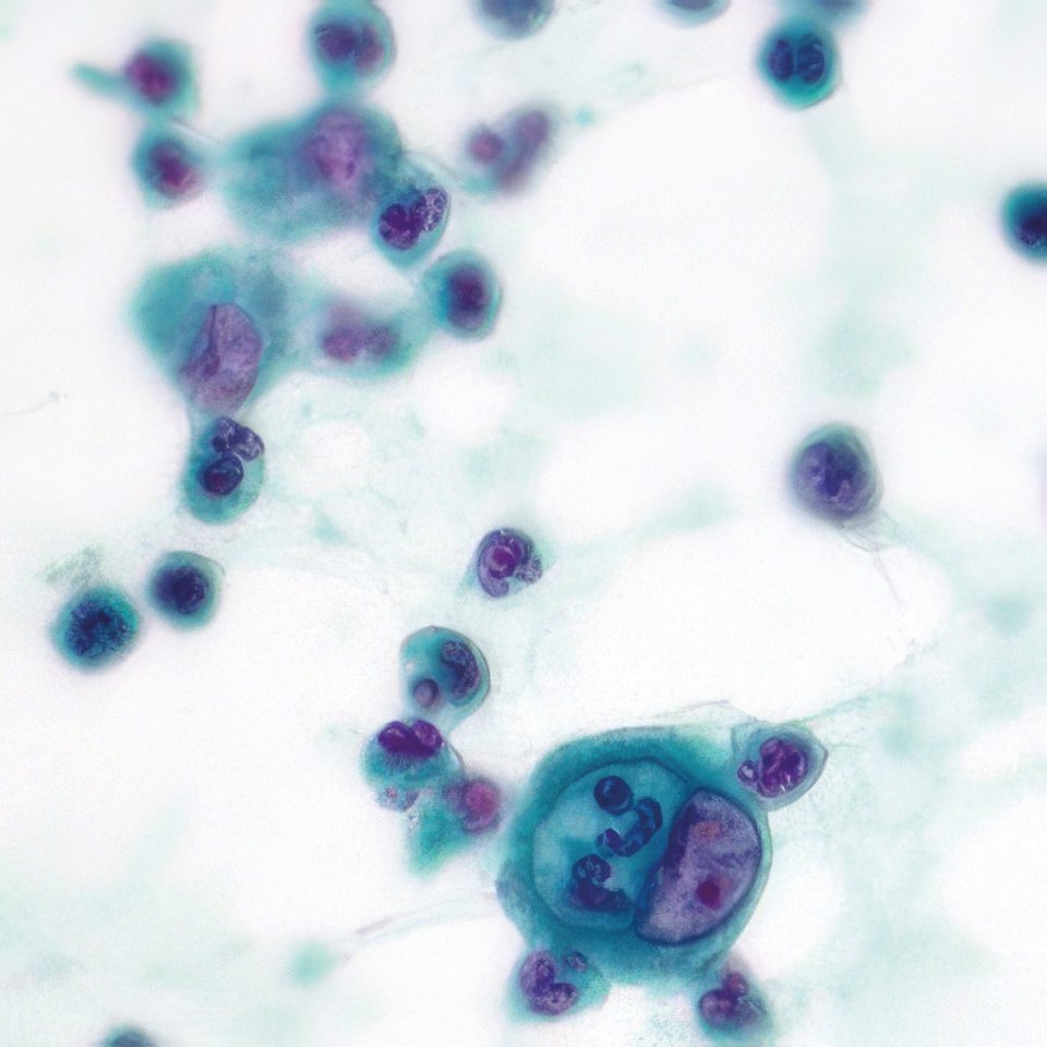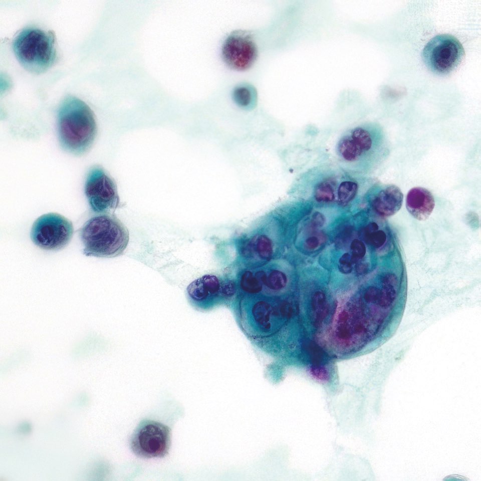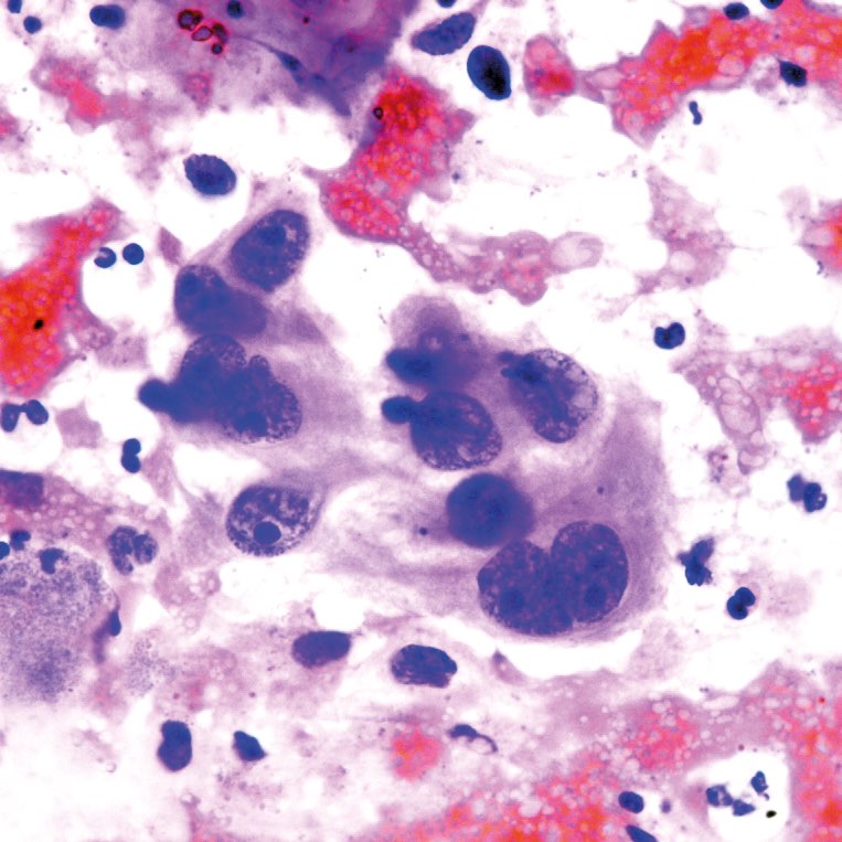 Einige lose Ansammlungen großer atypischer Zellen. Die Zellkerne variieren in der Größe, sind deutlich grob strukturiert und enthalten gelegentlich einen Nukleolus. Das Zytoplasma variiert in der Breite und ist manchmal geschwänzt. Der Hintergrund besteht aus Blut, einigen Entzündungszellen und Zelltrümmern.
