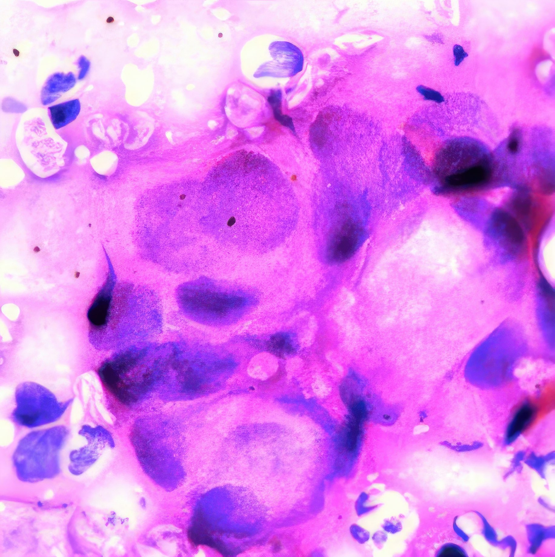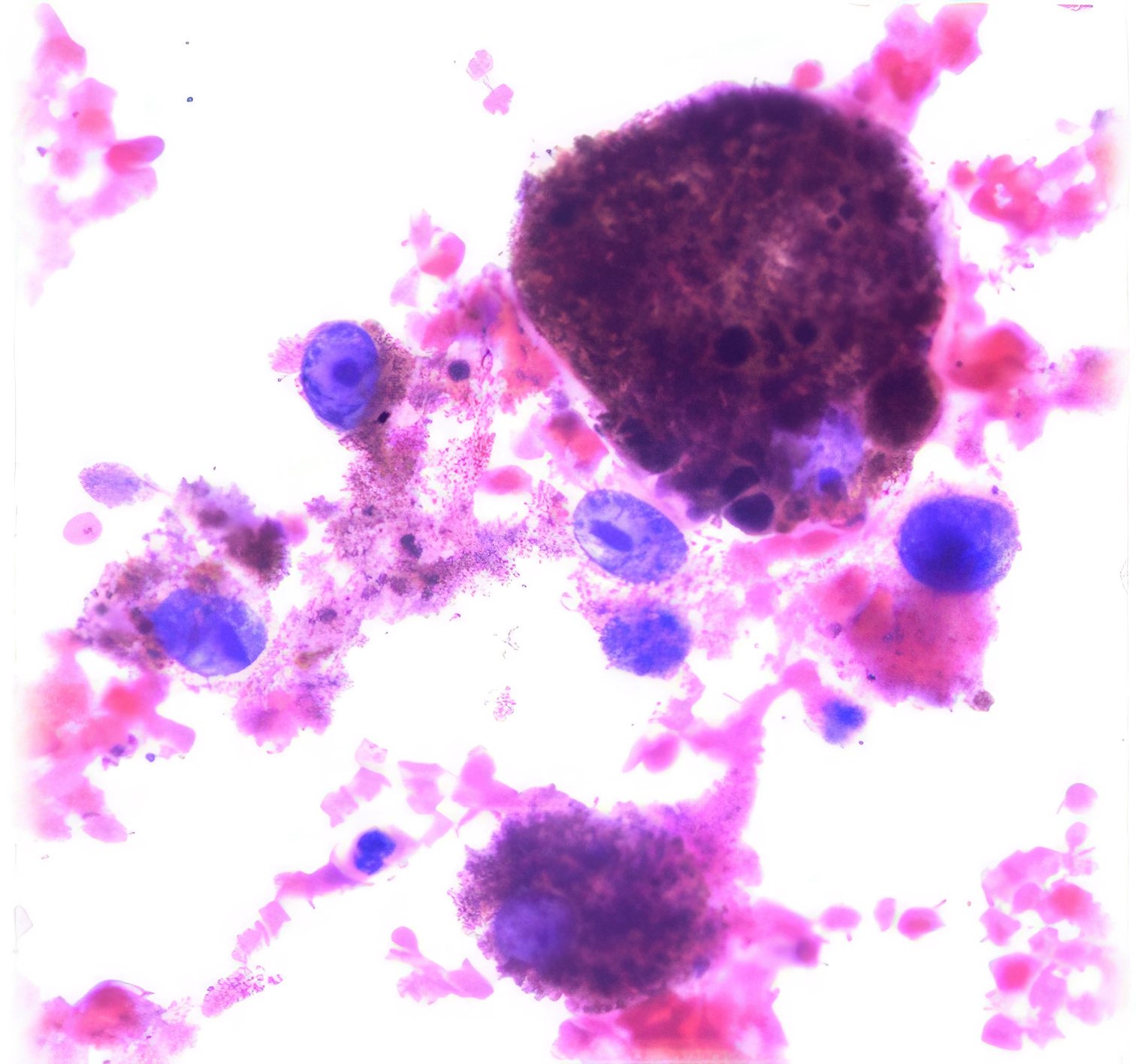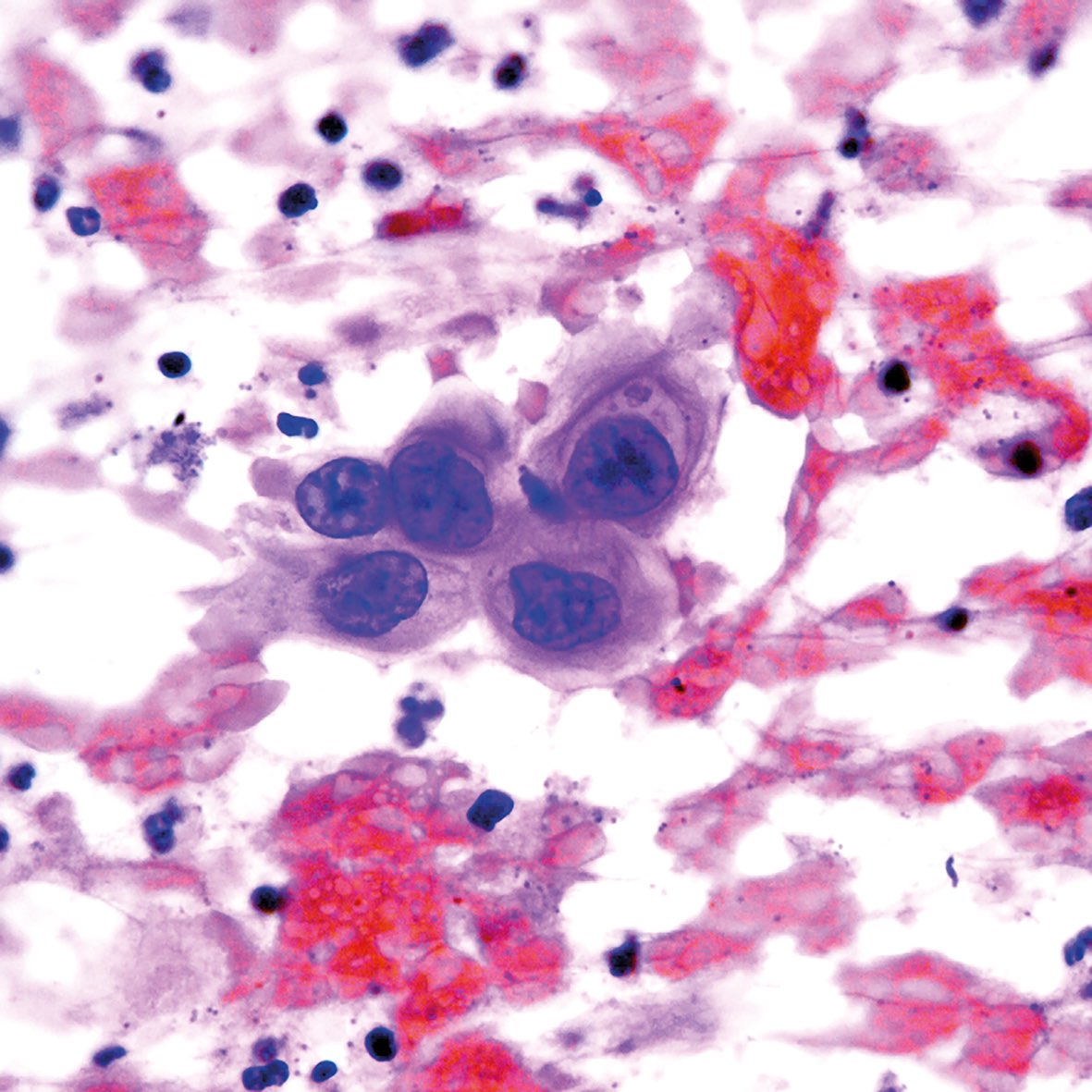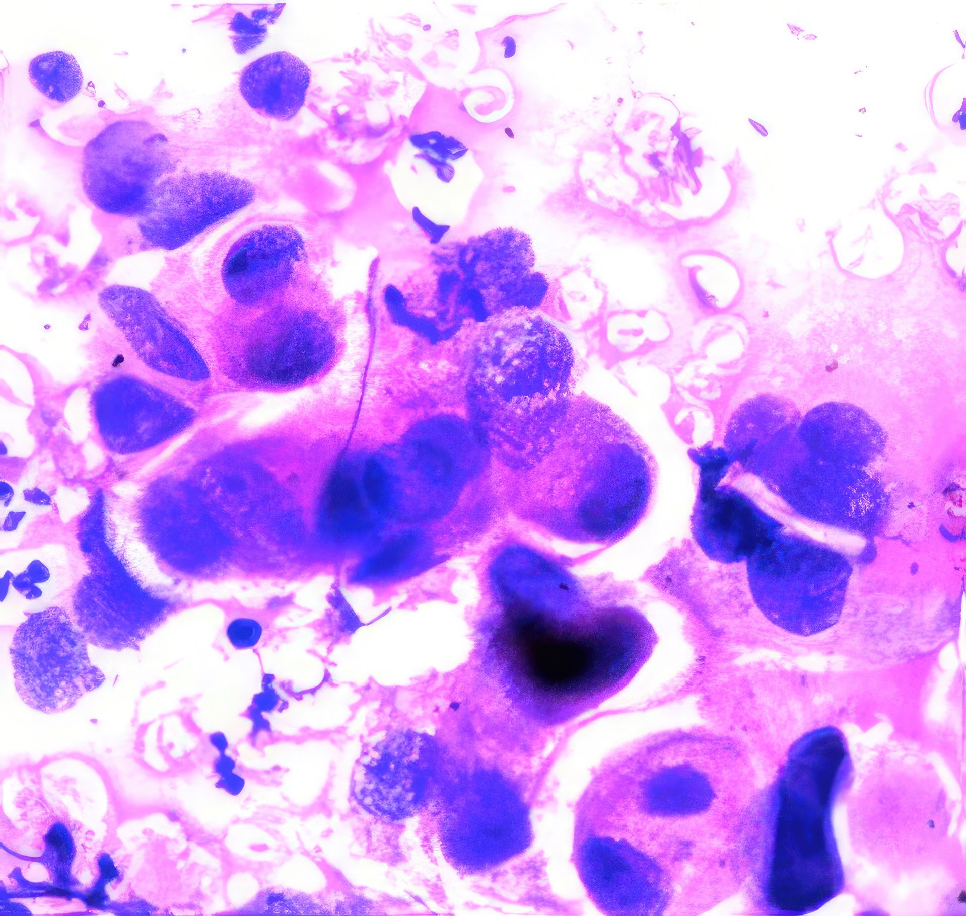 Einige lose Ansammlungen großer atypischer Zellen. Die Zellkerne variieren in der Größe, sind deutlich grob strukturiert und enthalten gelegentlich einen Nukleolus. Das Zytoplasma variiert in der Breite und ist manchmal geschwänzt. Der Hintergrund besteht aus Blut, einigen Entzündungszellen und Zelltrümmern.