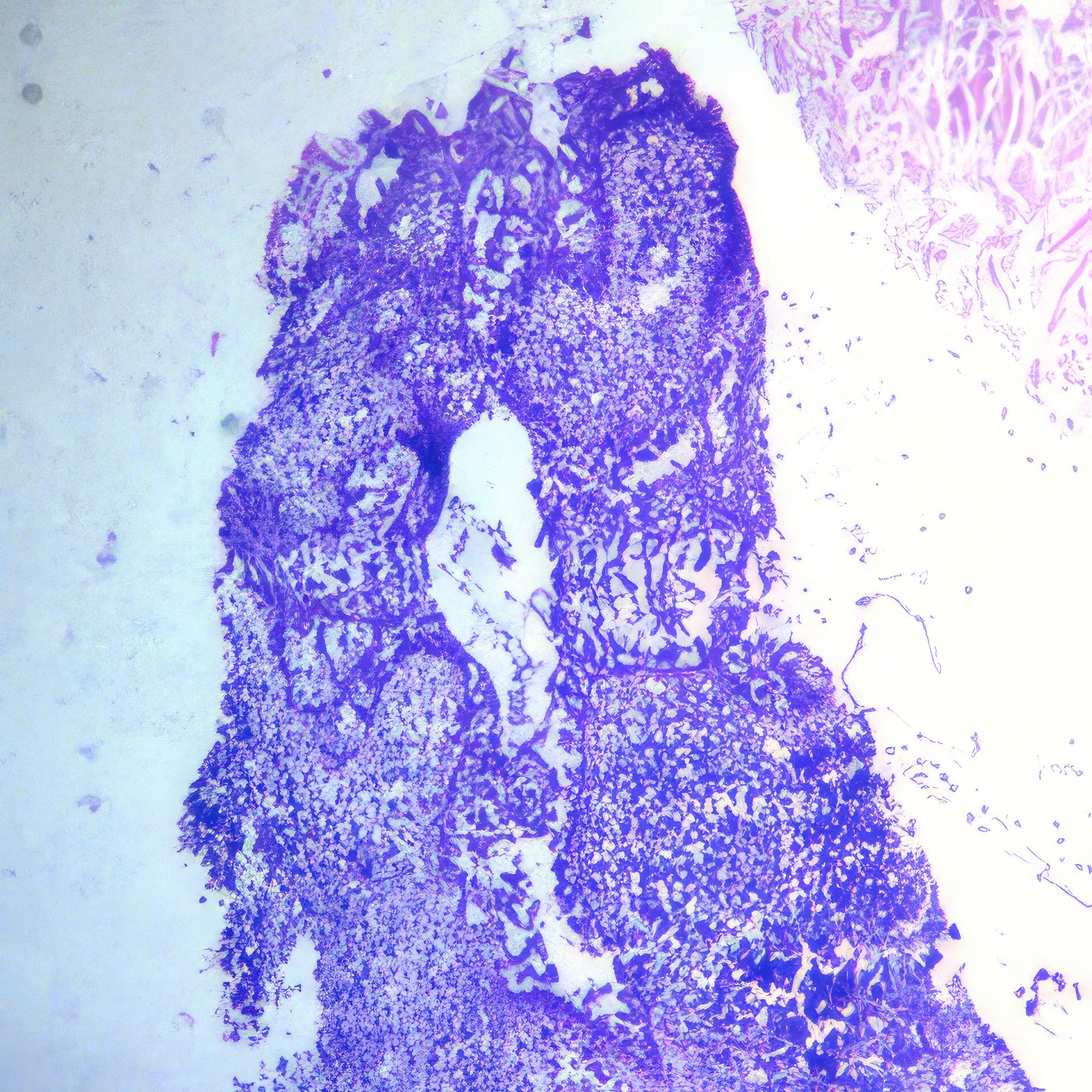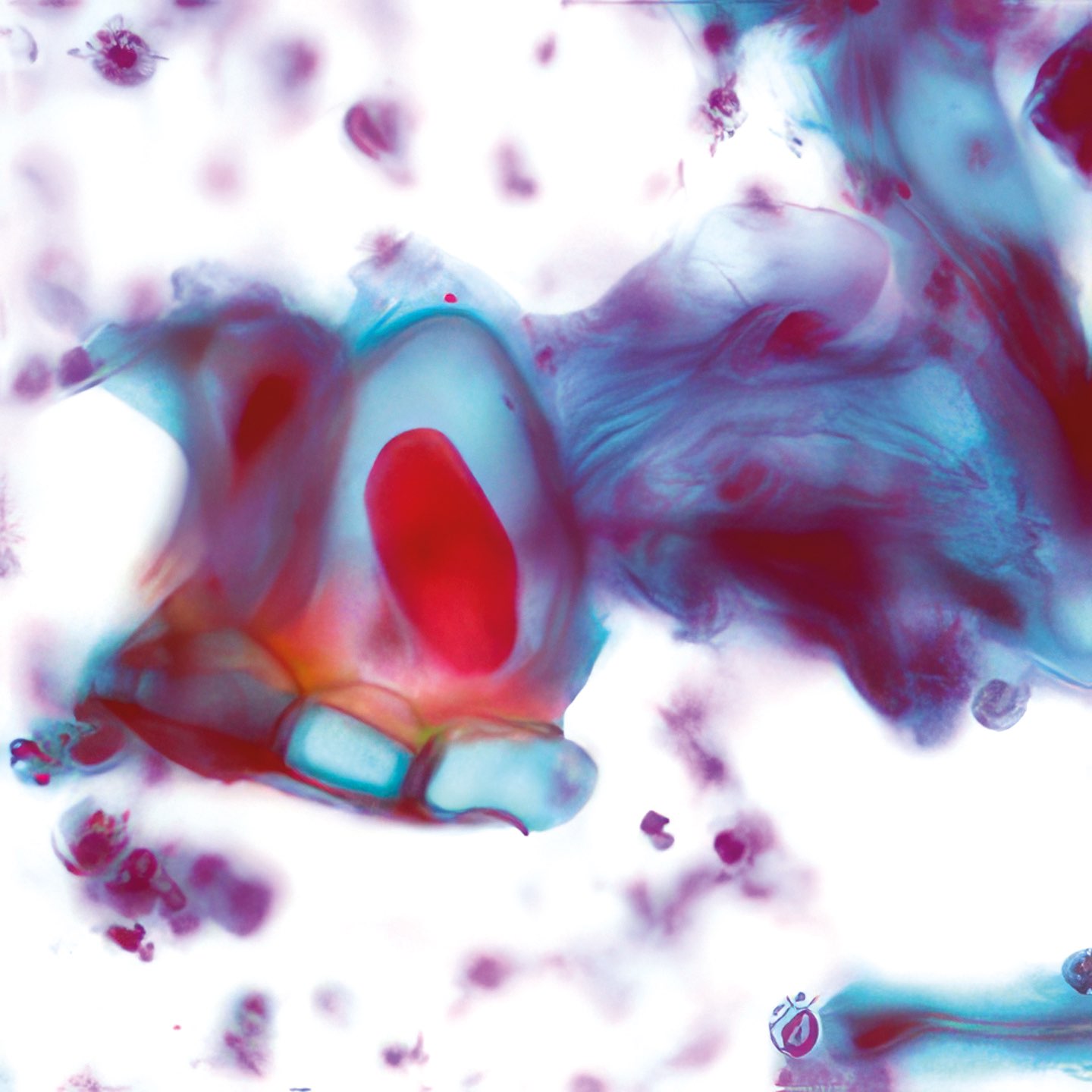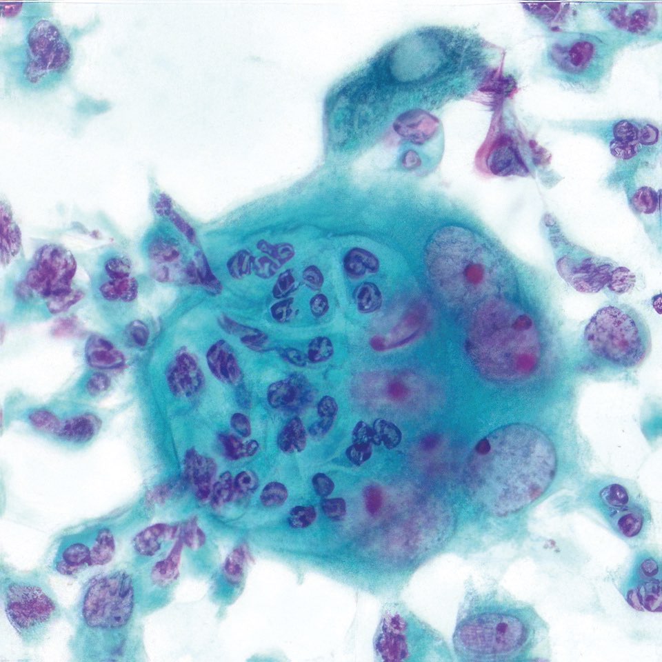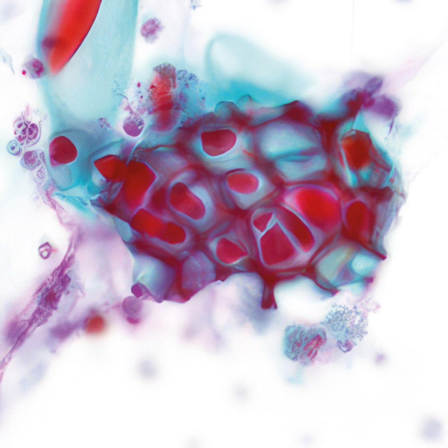 Einige lose Ansammlungen großer atypischer Zellen. Die Zellkerne variieren in der Größe, sind deutlich grob strukturiert und enthalten gelegentlich einen Nukleolus. Das Zytoplasma variiert in der Breite und ist manchmal geschwänzt. Der Hintergrund besteht aus Blut, einigen Entzündungszellen und Zelltrümmern.