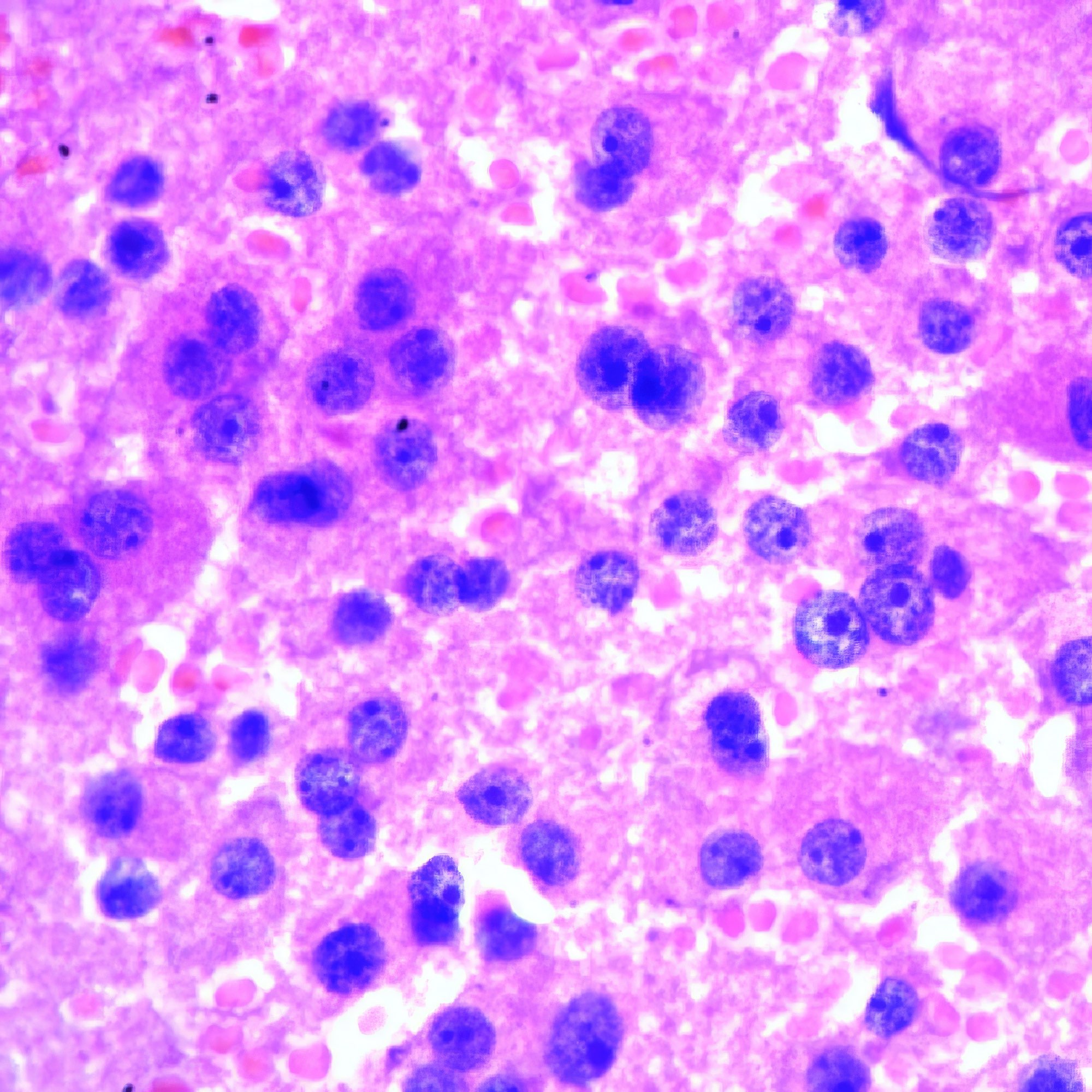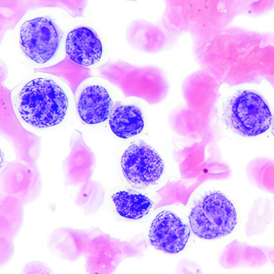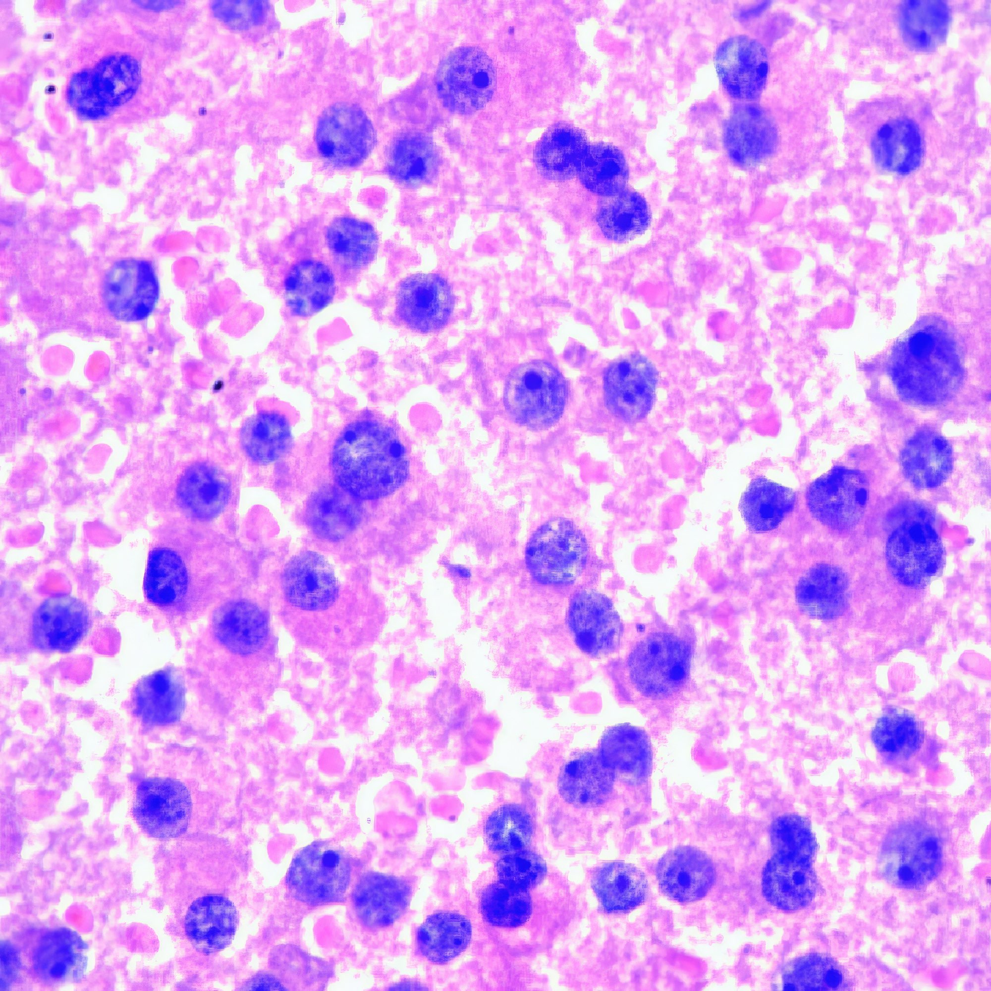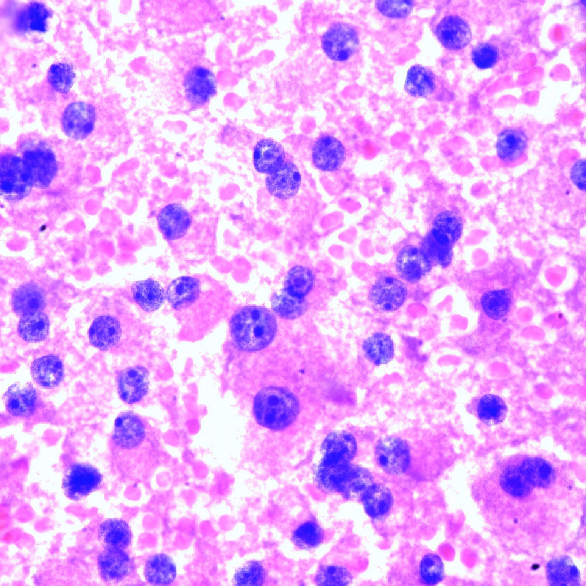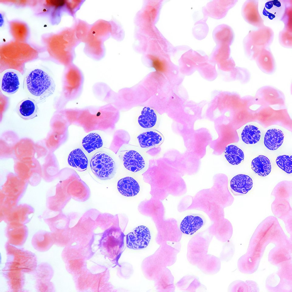 Einige lose Ansammlungen großer atypischer Zellen. Die Zellkerne variieren in der Größe, sind deutlich grob strukturiert und enthalten gelegentlich einen Nukleolus. Das Zytoplasma variiert in der Breite und ist manchmal geschwänzt. Der Hintergrund besteht aus Blut, einigen Entzündungszellen und Zelltrümmern.