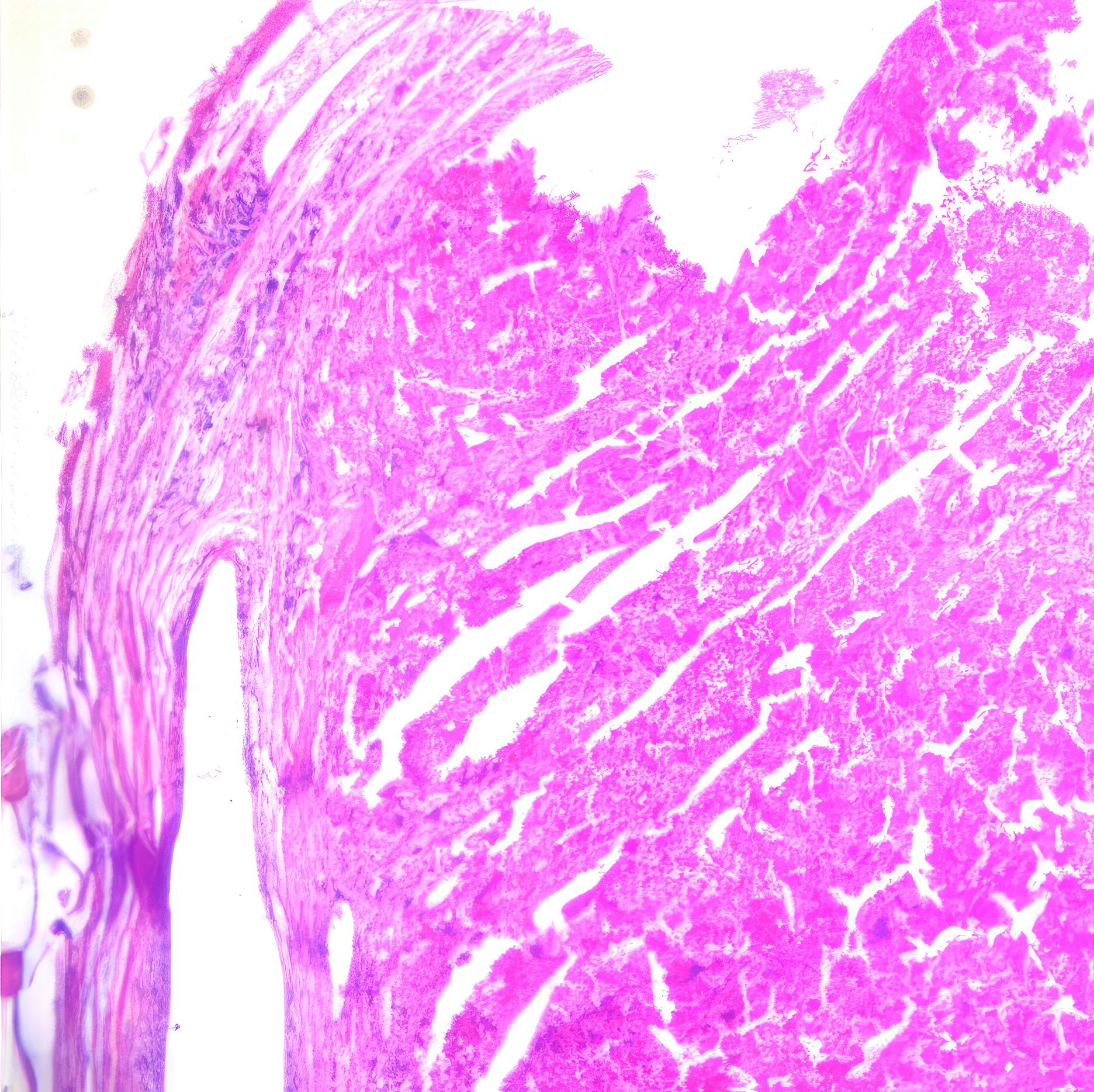 Das durch Stanzbiopsie gewonnene histologische Präparat zeigt viele große, scheinbar vakuolisierte Zellen innerhalb des Plattenepithels. Eine PAS-Färbung war nicht möglich.