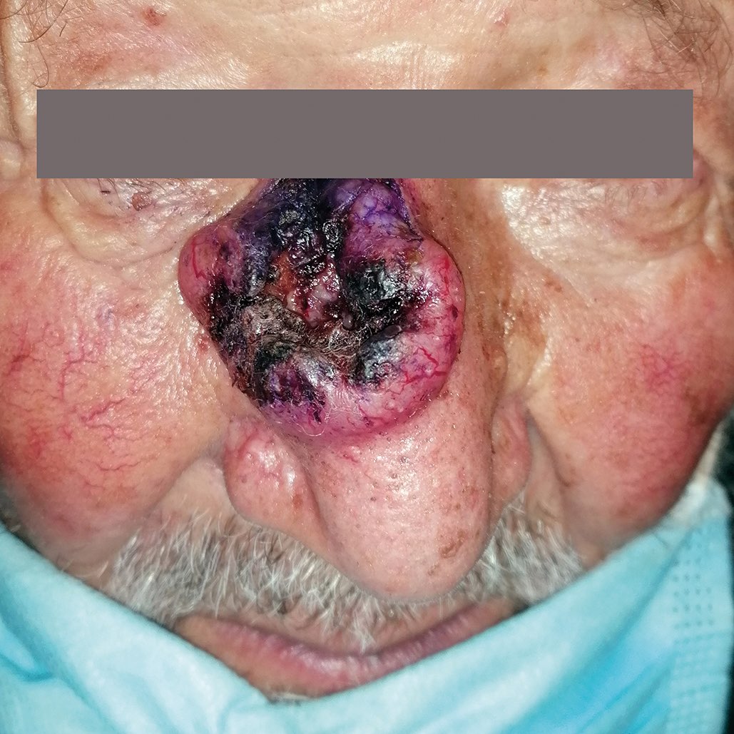 Ulzerierte nasale Hautveränderung seit 8 Monaten, 3 x 2 cm im