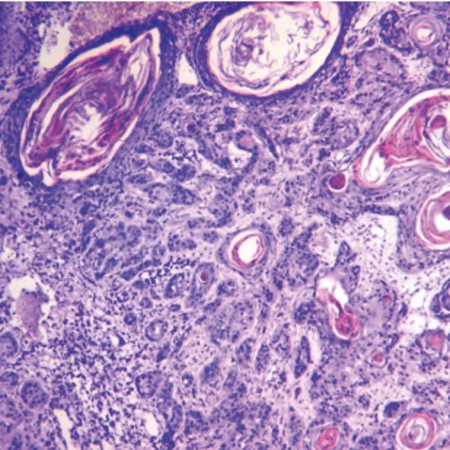 In der zytologischen Literatur gibt es zahlreiche Abhandlungen über die zytologische Diagnose von Hautläsionen. Die Informationen zur Materialentnahme reichen von Quetschungen, Abdrucken, Bürstenabstrichen bis hin zur FNA. Das Spektrum der Hautläsionen ist breit gefächert. Es reicht von Basalzellkarzinomen (BCC), Plattenepithelkarzinomen (SqCC), verschiedenen Haarfollikeltumoren bis hin zu Metastasen von Tumoren anderen Ursprungs {1-5}. Wegen der sich überschneidenden morphologischen Kriterien sind eine genaue Anamnese und Lokalisation sowie ein Makrofoto der Hautläsion hilfreich. Die histologische Diagnose lautete “keratinisierendes Plattenepithelkarzinom” (Abb. 5). Die keratinisierten Zellen waren zytologisch nicht nachweisbar. Allerdings sprechen die variable Kerngröße und das relativ breite Zytoplasma gegen ein BCC.